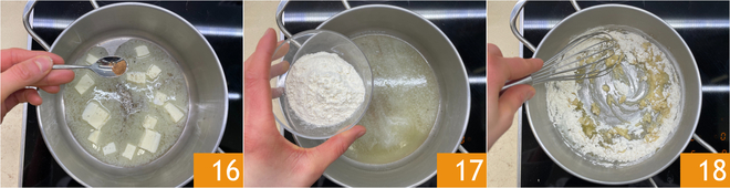Machen Sie weiter mit der Béchamel: Schmelzen Sie die Butter in einem kleinen Topf und würzen Sie mit Salz, Pfeffer und Muskatnuss 16. Erwärmen Sie in der Zwischenzeit die Milch in einem separaten kleinen Topf. Wenn die Butter geschmolzen ist, fügen Sie das Mehl auf einmal hinzu 17 und rühren Sie kräftig mit einem Schneebesen, um das Roux zu bilden 18.