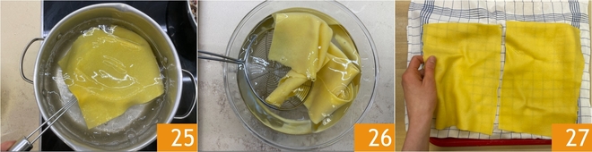 Nach der Ruhezeit des Teigs nehmen Sie den Teigklumpen und drücken Sie ihn leicht auf die Arbeitsfläche 22, dann geben Sie ihn in die Nudelmaschine, beginnend mit der breitesten Dicke bis zur letzten; Sie sollten etwa 1-2 mm dicke Blätter erhalten 23. Schneiden Sie die Blätter in Rechtecke, die etwas kleiner als die Form, die Sie verwenden werden, sind 24.
