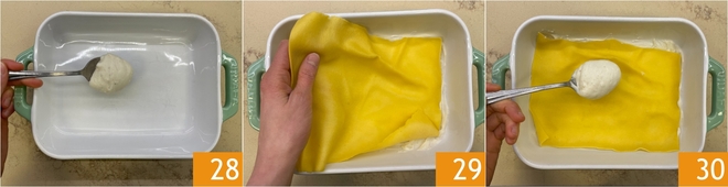 Sie sind bereit, die Lasagne zu montieren: Nehmen Sie eine Form von 24x18 cm und bestreichen Sie den Boden mit der Béchamel 28, dann legen Sie ein Pastablatt darauf 29 und bedecken Sie es mit weiterer Béchamel 30.