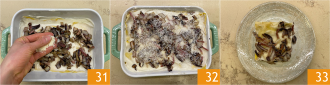 Fügen Sie die Mischung aus Radicchio und Speck hinzu und bestreuen Sie mit dem geriebenen Parmigiano Reggiano 31. Fahren Sie fort, die Schichten auf diese Weise abzuwechseln, bis Sie alle Zutaten verbraucht haben, und enden Sie mit einer Schicht Béchamel, Radicchio und geriebenem Käse. Backen Sie in einem vorgeheizten statischen Ofen bei 180° für etwa 30-35 Minuten 32. Wenn sie an der Oberfläche goldbraun ist, aus dem Ofen nehmen und einige Minuten ruhen lassen. Ihre Lasagne mit Radicchio ist bereit zum Servieren 33!