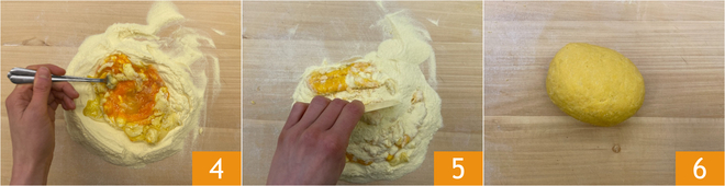Beginnen Sie, die Zutaten mit einer Gabel zu vermengen, indem Sie nach und nach das Mehl einarbeiten 4, dann fahren Sie mit der Hand fort und helfen sich mit einem Teigschaber 5. Wenn Sie einen glatten und homogenen Teigklumpen erhalten haben 6, wickeln Sie ihn in Frischhaltefolie und lassen Sie ihn etwa 30 Minuten bei Raumtemperatur ruhen.