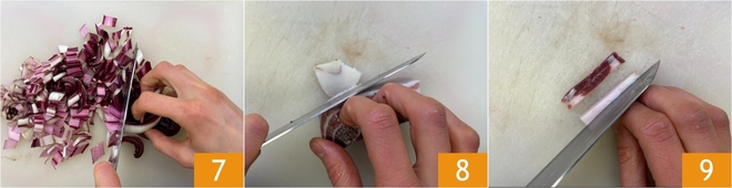 In der Zwischenzeit widmen Sie sich der Füllung: Waschen Sie den Radicchio und schneiden Sie ihn in Streifen 7. Entfernen Sie die Schwarte vom Speck 8 und schneiden Sie ihn in Streifen 9.