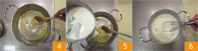 Um die Lasagne mit Romanesco und Speck zuzubereiten, beginnen Sie mit der Bechamel: Erhitzen Sie die Milch mit Salbei und Rosmarin in einem Topf 1. In einem anderen Topf schmelzen Sie die Butter bei sehr schwacher Hitze 2, sobald sie geschmolzen ist, fügen Sie das gesamte Mehl hinzu 3.