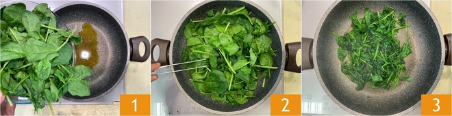 Um die Lasagne mit Schinken und Spinat zuzubereiten, beginnt ihr mit dem Spinat. Gebt ihn in eine Pfanne mit etwas Öl 1 und einer Prise Salz, rührt um 2 und lasst ihn bei mittlerer bis niedriger Hitze für ein paar Minuten welken 3.