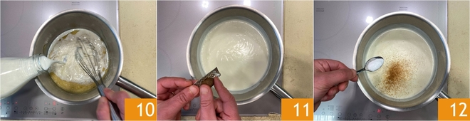 Gebt dann unter ständigem Rühren die kalte Milch nach und nach hinzu 10, bis die Sauce eingedickt ist. Fügt reichlich frisch geriebene Muskatnuss hinzu 11 und eine Prise Salz 12.