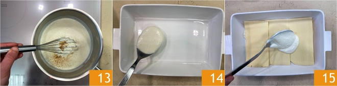 Gut umrühren 13 und die Béchamel vom Herd nehmen. Jetzt die Lasagne schichten, dafür eine große Form (30 x 20 cm) verwenden: Etwas Béchamel auf den Boden geben 14, dann 3 Eier-Nudelplatten einlegen und mit weiterer Béchamel bedecken 15.
