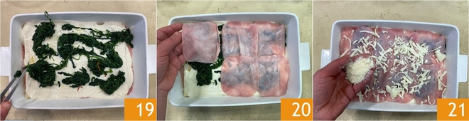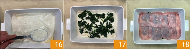 Die Béchamel mit dem Rücken eines Löffels gut verteilen 16, dann den Spinat hinzufügen 17 und die Scheiben Kochschinken darauf legen 18. Gebt etwas Mozzarella und frisch geriebenen Parmigiano darüber 18.