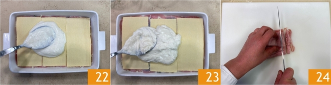 So schichtet ihr weiter, bis ihr 5 Lagen erreicht habt. Die oberste Schicht sollte aus Nudelplatten und reichlich Béchamel bestehen 23. Verteilt sie gut mit dem Rücken des Löffels. Schneidet den restlichen Kochschinken in Streifen 24.