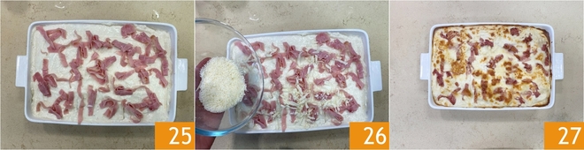 Verteilt die Schinkenstreifen auf der Béchamel 25, dann gebt noch etwas Mozzarella und frisch geriebenen Parmigiano darüber 26. Backt im vorgeheizten Ofen bei 220C für 20–25 Minuten, dabei die Form die ersten 15 Minuten unten und die restlichen 10 Minuten weiter oben platzieren. Nehmt die Lasagne aus dem Ofen und serviert sie heiß 27!