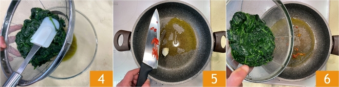 Gebt ihn in ein Sieb, damit überschüssige Flüssigkeit abtropft 4. Bratet in derselben Pfanne Öl, Knoblauch und Chili an 5, dann gebt ihr den Spinat dazu 6.