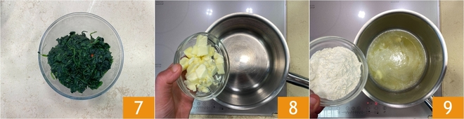 Bratet ihn ein paar Minuten an, damit er Geschmack annimmt, dann gebt ihn in eine Schüssel 7. Jetzt zur Béchamel: Gebt die Butter in einen kleinen Topf 8 und lasst sie schmelzen, dann fügt ihr das Mehl hinzu 9 und rührt schnell um.