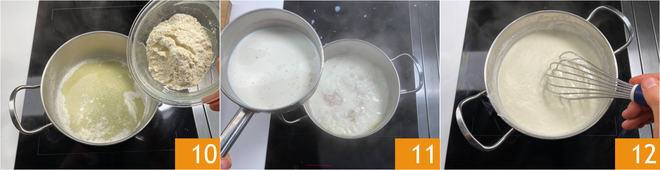 In einem anderen Topf die Butter schmelzen, dann das Mehl dazugeben 10 und kräftig mit dem Schneebesen rühren. An diesem Punkt die heiße Milch in 2 oder 3 Portionen hinzufügen 11 und weiter kochen, rühren, bis die Soße eingedickt ist 12. Die Béchamel abkühlen lassen.