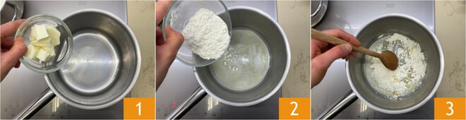 Um die Lasagnepäckchen mit Zucchini zuzubereiten, beginnen Sie mit der Béchamelsoße: Schmelzen Sie die Butter in einem kleinen Topf 1, dann geben Sie das Mehl hinzu 2. Rühren Sie schnell mit einem Löffel um, damit die geschmolzene Butter das Mehl aufnimmt 3.