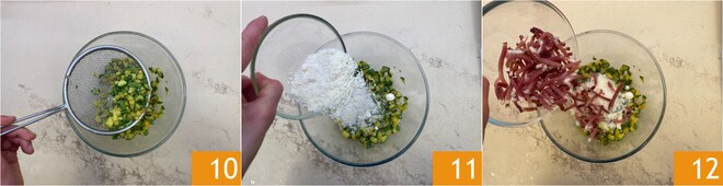 Wenn die Zucchini fertig sind, geben Sie sie in eine Schüssel 10, würzen Sie sie mit geriebenem Parmigiano Reggiano DOP 11 und Speck 12.