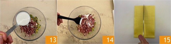 Fügen Sie eine Kelle Béchamelsoße hinzu 13 und rühren Sie, um die Füllung zu vermischen 14. Nehmen Sie nun die frischen Eiernudelblätter: Schneiden Sie jedes Blatt der Länge nach mit einem Messer oder einem Pizzaroller in zwei Hälften 15.
