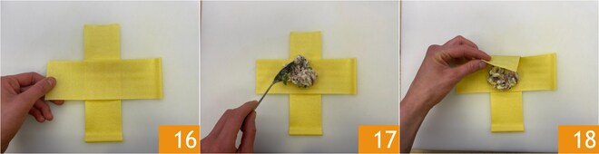 Legen Sie die beiden Streifen kreuzweise übereinander 16 und füllen Sie die Mitte mit einem Löffel der Füllung 17. Jetzt klappen Sie einen Rand des Nudelblattes zur Mitte hin, beginnend mit dem äußeren Streifen 18.