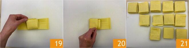 Klappen Sie auch den anderen äußeren Rand um 19, dann überlappen Sie die beiden verbliebenen seitlichen Ränder 20. Die Päckchen sind fertig, legen Sie sie auf ein Tablett mit der Naht nach unten 21.