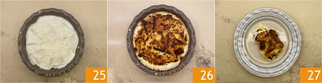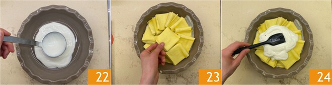 Nehmen Sie eine Auflaufform, wir haben eine konische Form mit 19 cm am Boden und 23 cm am Rand verwendet. Gießen Sie eine Schicht Béchamelsoße auf den Boden 22, legen Sie die Päckchen dann in einem leichten Kreis übereinander 23. Bedecken Sie sie mit der restlichen Béchamelsoße 24.