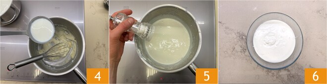Gießen Sie nun den Milchstrahl ein, während Sie mit dem Schneebesen weiterrühren 4, so bildet sich kein Klumpen. Kochen Sie die Sauce auf moderater Hitze weiter, um sie zu verdicken, sie sollte etwas flüssiger sein, salzen und pfeffern Sie nach Geschmack 5. Geben Sie die Béchamelsoße in eine Schüssel und lassen Sie sie abkühlen 6.