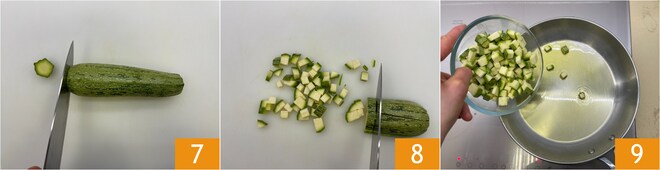 Kümmern Sie sich nun um die Füllung: Waschen und schneiden Sie die Zucchini 7, dann schneiden Sie sie in kleine Würfel 8. Erhitzen Sie etwas Olivenöl in einer Pfanne, geben Sie die Zucchini hinein 9 und braten Sie sie 10 Minuten auf mittlerer Hitze.