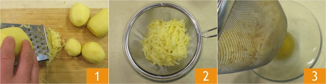 Um die Latkes zuzubereiten, schälen Sie die Kartoffeln und reiben Sie sie mit einer groben Reibe 1. Geben Sie die geriebenen Kartoffeln in ein Sieb über einer Schüssel und lassen Sie sie 10-15 Minuten ruhen 2: auf diese Weise verlieren sie das Wasser und werden nicht schwarz 3.