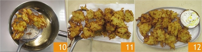 Braten Sie die Pfannkuchen insgesamt 3-4 Minuten, dabei von beiden Seiten wenden 10. Wenn sie schön goldbraun sind, auf Küchenpapier abtropfen lassen 11. Ihre Latkes sind bereit, noch heiß serviert zu werden, begleitet von saurer Sahne mit Dill 12!