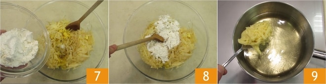 Zuletzt das Mehl 7 hinzufügen und alles mit einem Löffel vermischen 8. Gießen Sie zwei Finger hoch Olivenöl in einen Topf und erhitzen Sie es auf 170°, dann fügen Sie jeweils ein paar Löffel des Teigs hinzu 9.