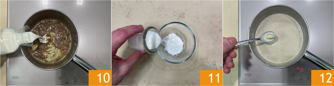 Fügen Sie die frische Sahne hinzu 10 und kochen Sie für 5 Minuten. Lösen Sie separat die Stärke in der Milch auf 11 und entfernen Sie den Knoblauch, wenn die Soße zu kochen beginnt 12.