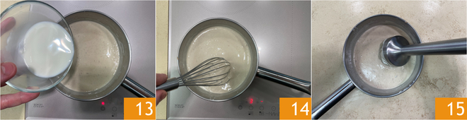 Gießen Sie die Mischung aus Stärke und Milch 13 nach und nach hinzu, bis die Soße leicht eindickt (vielleicht wird nicht die gesamte Menge benötigt) 14. Pürieren Sie sie mit einem Stabmixer, um sie glatter zu machen 15.