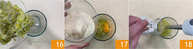 Holen Sie die gekochten Lauche heraus und geben Sie eine Menge von 300 g 16 in ein hohes Glas, zusammen mit den Eiern 17, dem geriebenen Parmigiano Reggiano 17 und pürieren Sie, um sie zu vermengen. Nun geben Sie Sahne und Milch hinzu 18.