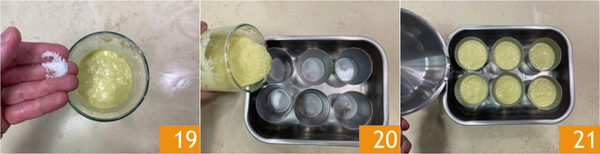 Salzen Sie die Mischung 19. Fetten Sie 6 Formen von 150 ml ein und stellen Sie sie in eine Backform, gießen Sie die Mischung ein 20, ohne sie bis zum Rand zu füllen 20. Gießen Sie in die Backform kochendes Wasser, bis die Formen zur Hälfte bedeckt sind 21. Backen Sie im vorgeheizten statischen Ofen bei 160°C für 35 Minuten.