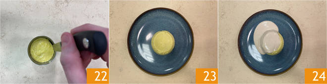 Holen Sie die Flans aus dem Ofen und lassen Sie sie abkühlen, dann fahren Sie mit der Klinge eines Messers am Rand entlang 22, um sie leichter zu lösen 22. Stürzen Sie den Flan auf einen Servierteller 23 und bedecken Sie ihn mit der Sardellensoße 24. Servieren Sie den Lauch-Flan mit Sardellensoße sofort.