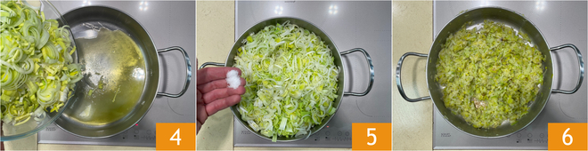 Um den Lauch-Flan mit Sardellensoße zuzubereiten, putzen Sie die Lauche, indem Sie den harten, grünen Teil entfernen 1, und schneiden Sie sie dann in Scheiben 2. Erhitzen Sie in einem Topf etwas Öl mit einem Stück Butter 3.