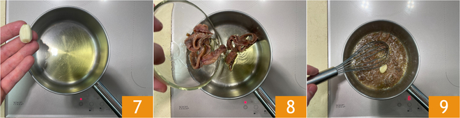 Bereiten Sie inzwischen die Sardellensoße zu: Geben Sie etwas Öl und eine Knoblauchzehe in einen kleinen Topf 7, lassen Sie sie bei schwacher Hitze aromatisieren, und sobald der Knoblauch anfängt zu brutzeln, geben Sie die Sardellen hinzu 8. Rühren Sie mit dem Schneebesen und lassen Sie sie bei schwacher Hitze schmelzen 9.