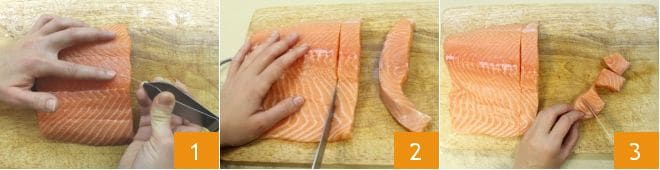 Um die Lauch-Kartoffel-Creme mit Lachsspieß zuzubereiten, beginnen Sie damit, das Lachsstück zu entgräten. Nehmen Sie eine Pinzette zur Hand und entfernen Sie die Gräten, die entlang des Rückens 1 verlaufen. Nachdem dies geschehen ist, überprüfen Sie das Fleisch erneut, um sicherzustellen, dass alle Gräten entfernt wurden. Schneiden Sie dann 4 Scheiben ab 2 und schneiden Sie daraus 4 gleichmäßige Würfel 3.