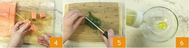 Formen Sie 4 Spieße, indem Sie 4 Lachswürfel auf jeden Spieß stecken 4 und sie in eine Auflaufform legen. Bereiten Sie nun die Emulsion vor, mit der Sie die Lachsspieße marinieren: Hacken Sie fein 2 Zweige Dill 5 und geben Sie das native Olivenöl extra in eine Schüssel 6.
