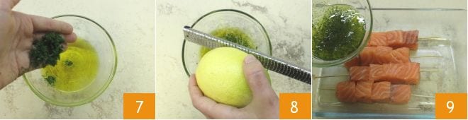 Geben Sie den Dill in die Schüssel mit dem Öl 7 und fügen Sie die abgeriebene Schale einer unbehandelten oder biologischen Zitrone hinzu 8. Dann übergießen Sie die Spieße mit der Dill-Öl-Emulsion 9. Im Gegensatz zum Saft wird die Zitronenschale den Lachs würzen, ohne ihn zu garen.