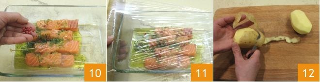 Bereichern Sie die Emulsion mit einem Esslöffel rosa Pfefferkörnern 10 und einer Prise Salz. Decken Sie die Auflaufform mit Frischhaltefolie ab 11 und lassen Sie die Lachsspieße im Kühlschrank 20 Minuten lang marinieren. In der Zwischenzeit widmen Sie sich der Zubereitung der Creme: Schälen Sie die Kartoffeln 12.