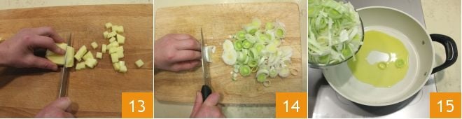 Teilen Sie die Kartoffeln in der Mitte, schneiden Sie sie dann in Streifen und schließlich in ziemlich kleine Würfel 13. Putzen Sie den Lauch, indem Sie die Enden entfernen und ihn in Ringe schneiden 14. Erhitzen Sie dann einen Schuss Öl in einem großen Topf und braten Sie den Lauch an 15.