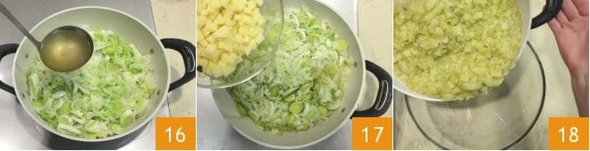 Löschen Sie mit einer Kelle Gemüsebrühe ab 16, um zu erfahren, wie Sie diese am besten vorbereiten, besuchen Sie unsere Kochschule: Gemüsebrühe. Lassen Sie die Gemüsebrühe verdampfen, dann fügen Sie die gewürfelten Kartoffeln hinzu 17, mischen Sie, salzen und pfeffern Sie nach Geschmack. Decken Sie mit der restlichen Brühe zu, decken Sie mit einem Deckel ab und kochen Sie 30 Minuten lang, bis die Kartoffeln weich sind. Nach dieser Zeit geben Sie alles in eine Schüssel 18.