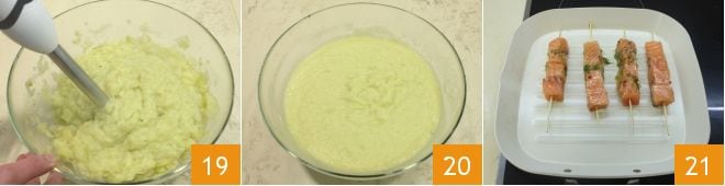 Pürieren Sie die Mischung mit einem Stabmixer 19, bis Sie eine cremige Konsistenz haben 20. Wenn die Creme zu dick ist, fügen Sie eine Kelle Gemüsebrühe hinzu. Nach den 20 Minuten nehmen Sie die Lachsspieße aus dem Kühlschrank, die sich mit Geschmack vollgesogen haben, und erhitzen Sie eine Grill- oder große Pfanne. Braten Sie dann die Spieße bei hoher Hitze, um die Außenseite zu bräunen und das Innere weich und saftig zu halten 21. Nur wenige Sekunden pro Seite, wenn sie gar sind, nehmen Sie sie aus der Pfanne, da die Garzeit sonst weitergehen würde. Bewahren Sie die Emulsion auf, sie wird Ihnen helfen, die Spieße während oder nach dem Garen weiter zu würzen.