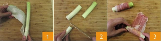 Um die Lauch mit Schinken zuzubereiten, schneiden Sie zunächst den Lauch ab, dann halbieren Sie ihn der Länge nach, um die äußeren Blätter zu entfernen 1. Schneiden Sie sie in 3 gleich große Teile 2, wickeln Sie eine Scheibe rohen Schinken um jedes Stück 3 und legen Sie sie beiseite.