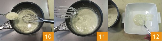und fügen Sie 25 g geriebenen Parmesan hinzu 10, die restlichen 5 g für die Garnierung beiseite lassen. Rühren Sie gut um und lassen Sie die Sauce bei mittlerer Hitze eindicken: Insgesamt dauert dies etwa 4 Minuten 11. Gießen Sie die Sauce auf den Boden einer Auflaufform, die der Größe der Lauchstangen entspricht 12: Wir haben eine quadratische Form von 20x20 cm verwendet.