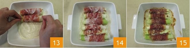 Legen Sie dann die Lauchstangen darauf 13, garnieren Sie mit dem restlichen geriebenen Parmesan, den Sie beiseite gelegt haben 14, und backen Sie sie in einem vorgeheizten statischen Ofen bei 180°C für 18 Minuten, für die letzten 2 Minuten auf Grillmodus bei 240°C umstellen. Sobald sich eine Kruste gebildet hat, sind die Lauch mit Schinken fertig zum Servieren 15.