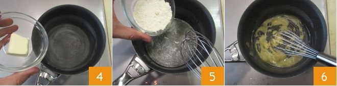Kümmern Sie sich inzwischen um die Parmesansauce: Geben Sie die Butter in einen kleinen Topf und schmelzen Sie sie bei niedriger Hitze 4, fügen Sie dann das gesiebte Mehl auf einmal hinzu 5 und rühren Sie kräftig mit dem Schneebesen 6.