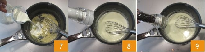 Gießen Sie die Sahne in Raumtemperatur nach und nach hinzu 7, salzen 8, pfeffern 9