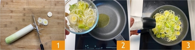 Um das Lauchomelett zuzubereiten, beginnen Sie mit dem Lauch. Entfernen Sie die äußeren Blätter, den grünen Teil und eventuell Wurzeln; dann schneiden Sie ihn in Scheiben von etwa 2 mm 1. In einer Pfanne mit 28 cm Durchmesser erhitzen Sie etwas Öl, dann fügen Sie den Lauch hinzu 2 und würzen ihn mit Salz 3.