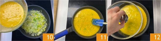 Gießen Sie die Mischung in die gut erhitzte Pfanne mit dem Lauch 10, dann verteilen Sie die Eier gleichmäßig mit einem Spatel 11 und decken Sie die Pfanne mit einem Deckel ab 12.