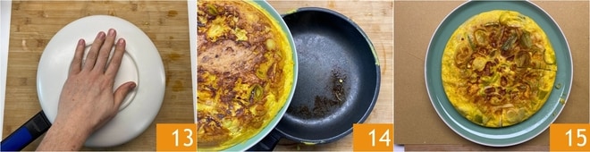 Kochen Sie das Omelett 15 Minuten bei mittlerer Hitze, dann wenden Sie es mit Hilfe eines Tellers 13 und geben Sie es zurück in die Pfanne 14. Lassen Sie es auch auf der anderen Seite 7 Minuten bei etwas reduzierter Hitze garen. Legen Sie das Lauchomelett auf einen Servierteller und servieren Sie es 15!