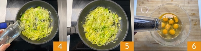 Braten Sie den Lauch etwa 6 Minuten bei mittlerer Hitze an, fügen Sie dabei in der Mitte der Garzeit etwas Wasser hinzu, damit er nicht verbrennt 4; er sollte goldbraun und gut angedünstet sein 5. Inzwischen geben Sie die Eier in eine Schüssel und würzen sie mit Salz und Pfeffer 6.
